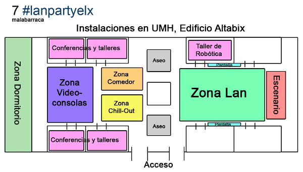 Para terminar deciros que también tendremos varias clases disponibles para realizar los distintos talleres que vamos a llevar a cabo, zona de aseos y pantallas informativas para que estéis al tanto del comienzo de las distintas actividades así como de las partidas que están lanzadas, una zona comedor, distinta de la zona LAN, la cual estará habilitada para que podáis comer como si estuvierais en casa. Una zona chill-out, distinta de la zona de dormir, donde podréis conversar con los participantes de la party y la zona Dormitorio, donde podremos descansar siempre que lo deseemos.